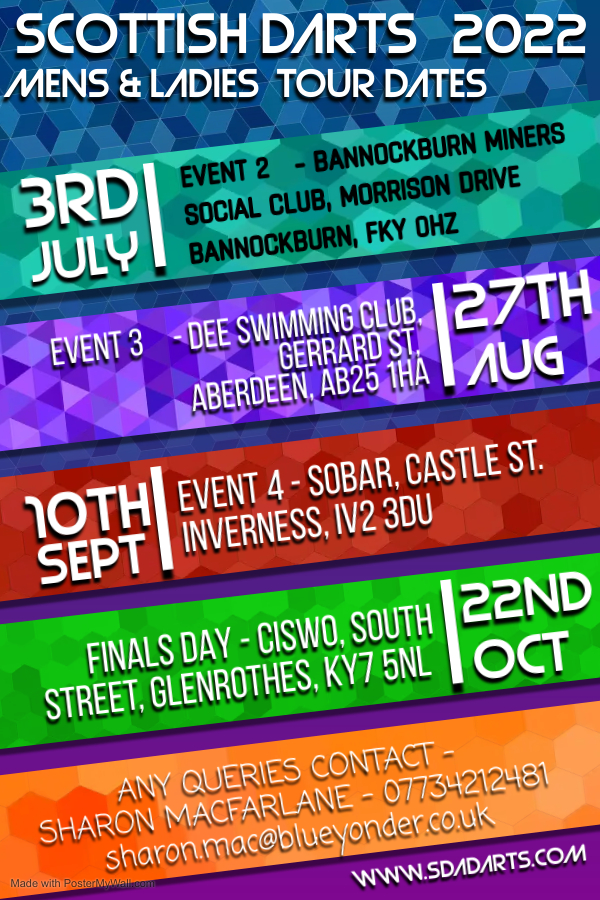 Events three and four have been scheduled and will see darts move to Aberdeen on Saturday 27th August at the Dee Swimming Club, Gerrard Street and then finally to Inverness for the fourth event which is being held at SoBar, Castle Street.